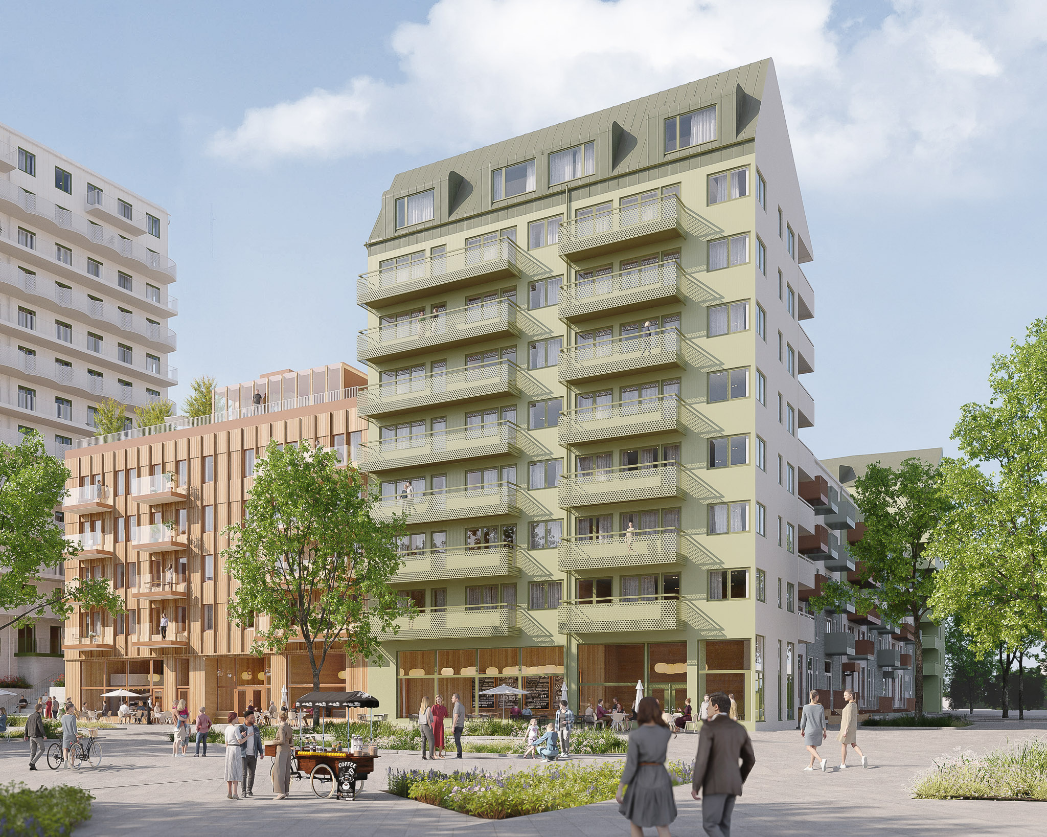 Här bygger vi 190 moderna och yteffektiva hyres- och bostadsrätter. I södra delen av kvarteret byggs ett 16 våningar högt torn som både utgör ett visuellt landmärke och markerar den nya stadsdelens norra entré. Smedjan ligger utmed områdets stora park, har en gemensam takterrass med växthus och erbjuder cykelpool. I bottenplan kommer det finns en livsmedelsbutik samt restauranger/café vid det stora torget.